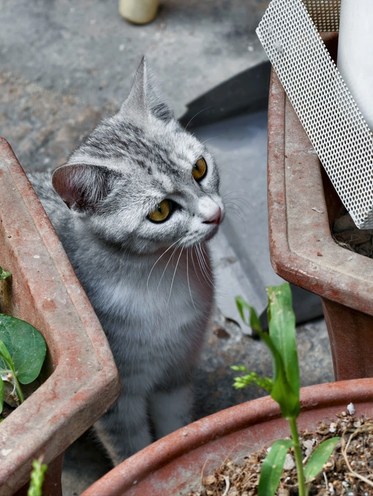在花盆间发现了这只小可爱,那圆溜溜的眼睛仿佛藏着无数好奇。它安静地待在那里,像是在探索属于它的小世界。