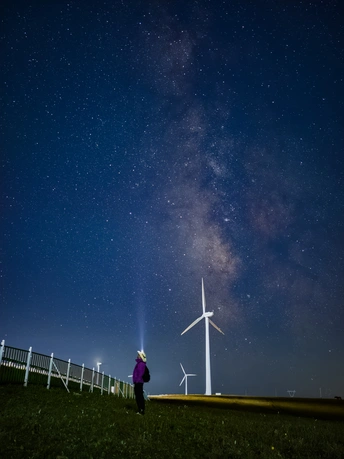 草原夜色如墨,银河倾泻成川。风车伫立轻转,孤灯遥应星辰。天地寂寥,唯星光与旷野的私语。