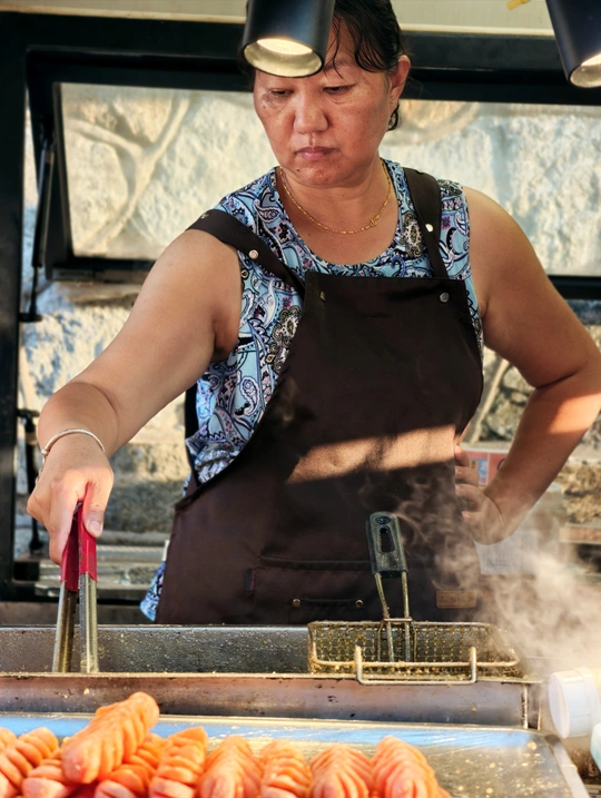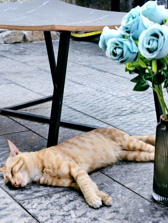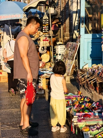 石板路上,橘猫惬意酣睡,把时光都拖慢。老墙角落,干花静默,竹编挂饰轻晃,彩穗与铃铛相和,晕染古韵。流水装置叮咚,似在哼着不紧不慢的调子 。鸟笼中鹦鹉欢唱,柴犬与萨摩咧嘴笑,用热情点亮街巷。 阿婆专注翻动美食,蒸腾热气里藏着平凡日常的温度。不远处,父女俩在摊位前驻足,好奇目光探寻小物件里的奇妙,亲子间的温馨悄然流淌。 红灯笼映着旧巷,有人倚栏,看光影爬过砖墙。这里没有喧嚣奔忙,只有生活本真的模样,一帧帧画面,像缓缓流淌的溪流,浸润心灵,治愈且温暖。