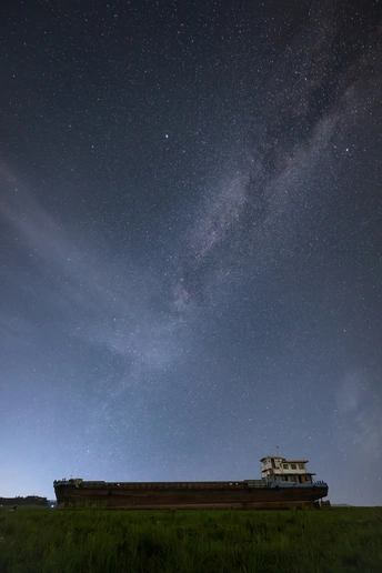 星潮浮没夜舟轻,铁骨苍茫卧沧溟。 千点寒芒沉锈迹,一舟星梦压翠海。 云移暗渡天枢影,风至犹闻草呓语。 欲唤星槎同载月,残桅斜指斗牛横。