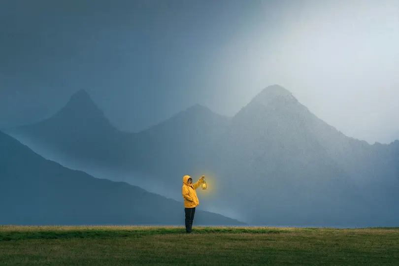 在喀拉峻大草原碰到了大雾,当时还下着雨,远处的山峰朦朦胧胧,顶着风雨拍下了这张照片.