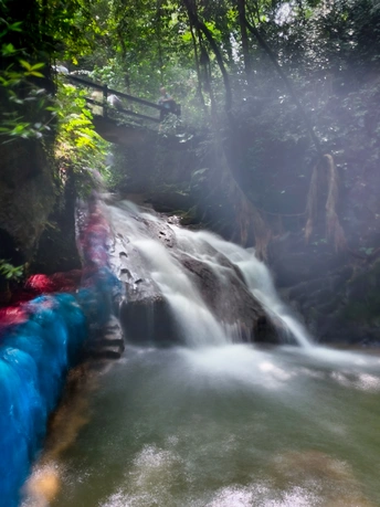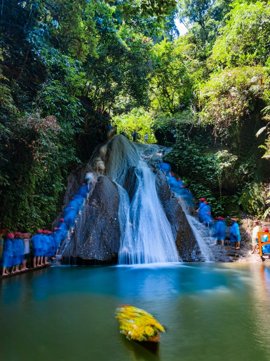 瀑布不是从岩壁坠落,是从墨绿的苔藓脉络里诞生的。那张黄花摇晃的木船飘在潭心,实则是阿婆用老杉树的心雕出的信筏——船帮绑着野姜花串,香气浮游在湿润的空气里,引逗得蓝雨衣们调色盘里的青与靛都活了过来,调色板浸入深潭的刹那,山的魂魄就被镀在了画布上。 穿蓝衣的人群并不惊扰水的呼吸,他们衣袂的钴蓝融进雾气,恰似把破碎的云絮染出了形状。石岸上,一个女孩指尖滴落的藤黄颜料坠入浅滩,瞬间被水流卷成金箔。恍惚间所有笑声都静了,只听见飞流凿击岩石的韵律,正与远处飘来的模糊侗歌彼此应和——那是几十年前浣衣的阿婆遗落在此的余韵。 当镜头转向另一重时空,瀑布便显露沉静的脊梁。左岸红蓝交织的防护网悬垂如纱,不是冰冷的阻隔,而是文明给狂野佩戴的一条蕾丝饰带。它允准稚童探身承接飞溅的琼玉,同时挡开草叶间蠢动的塑料袋阴影。木栈道新削的断面还散逸树脂香,却留下几处粗糙树疤容脚步踩出吱呀声,仿若百年前老栈道借新木还魂。桥上执老相机的人影像苔石般静默——他的手柄浸润了祖父的汗渍,快门声与七十年前山风穿过镜箱的气流同一音调。原来瀑布能同时盛放两种月光。蓝衣彩筏是人间投来的吻痕,新桥旧镜是时间绣成的锦帛。