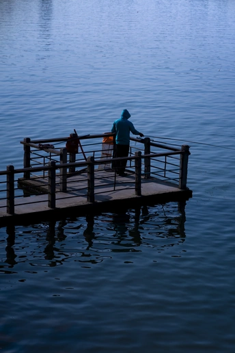 深邃的水与渔者相照应,一点红色的渔网作为点缀
