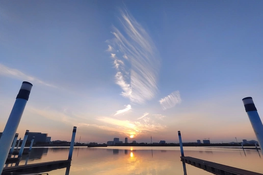 作品名称: 蝶舞娥江 作品简介:浙江的曹娥江作为京杭大运河、海上丝路的一部分,承载了太多传奇,其中包括了英台故里、梁祝的爱情故事。 傍晚的江面上晚霞如蝴蝶翩跹起舞,映衬江边城市的美景反映了整座城市的美好蜕变。