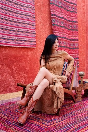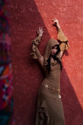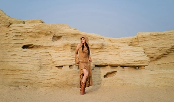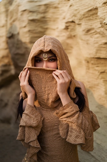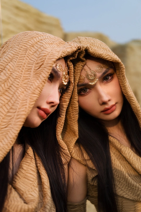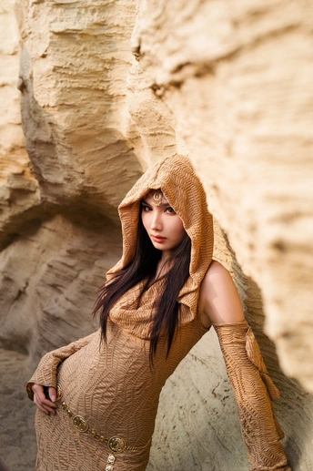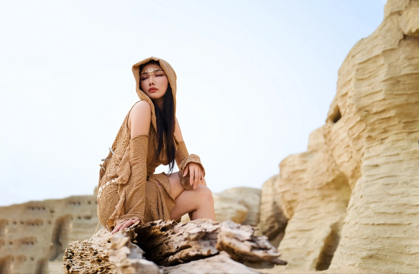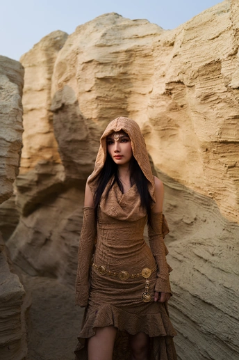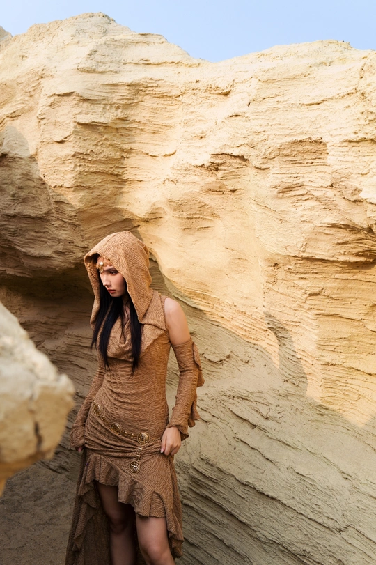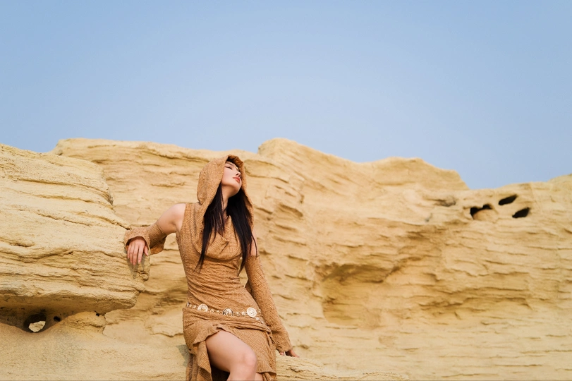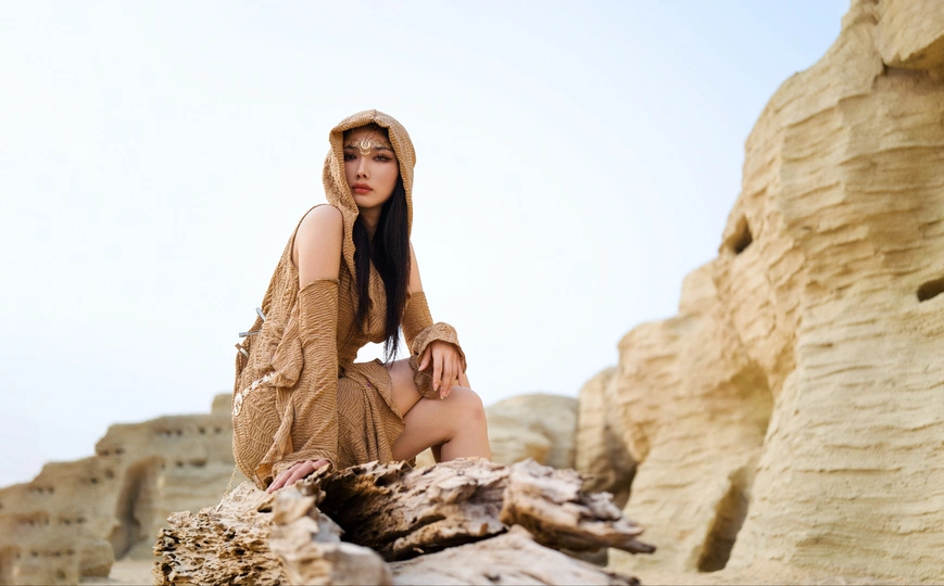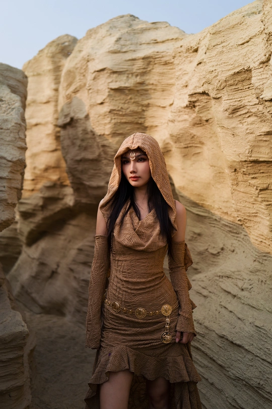 被这片戈壁的苍茫美到失语 裹上带帽长裙 戴上额间坠饰 仿佛从古老传说里走出的旅人 每一粒细沙都藏着故事 风掠过耳畔 像是在诉说千年过往 在自然雕琢的岩壁间 与神秘异域感撞个满怀 这一刻 我成了沙漠独有的风景✨