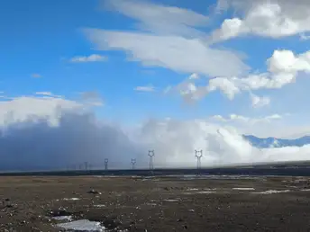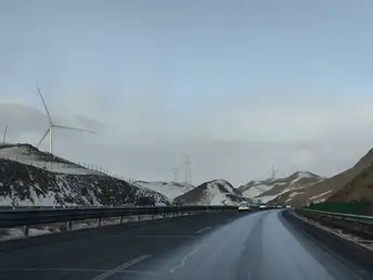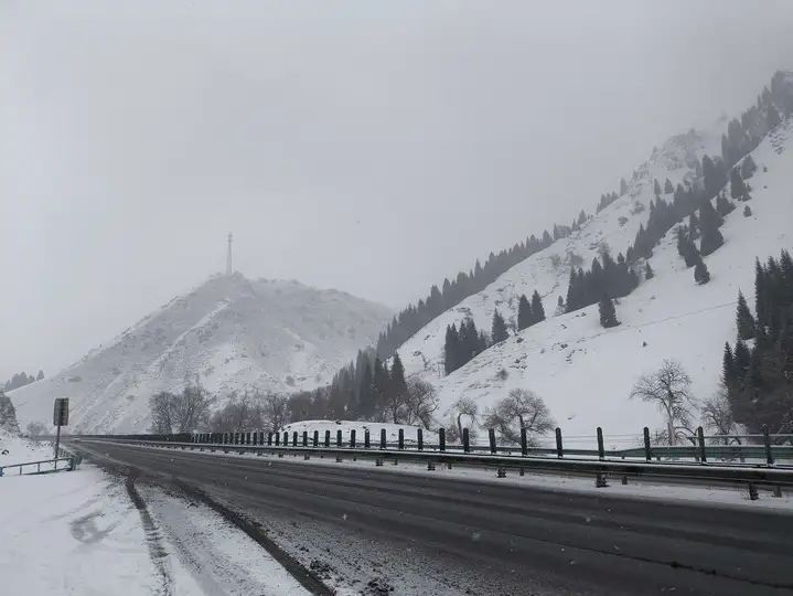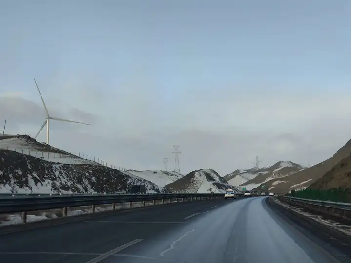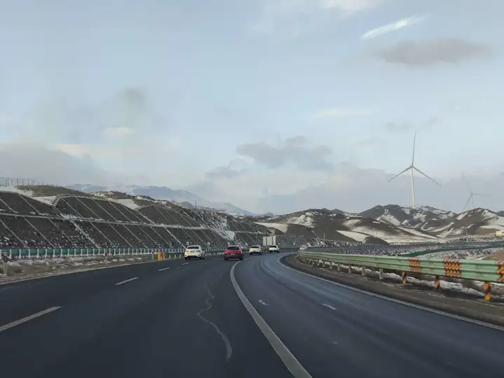 这张照片拍摄于今年冬天,从伊犁返回博州的漫长高速路上。车窗外是北疆典型的深冬景象:戈壁滩上被雪稀疏覆盖,在这大风之中没有什么可以长时间停留,无论是风吹雪还是归途人。 路像一条倔强的黑色缎带,切开这片山脉。我坐在车上,望着前方仿佛没有尽头的路面,感受着窗外不时出现的风和雪。当车辆驶过一段视野开阔的缓坡,我迅速用手机对准窗外——定格下这一刻:被车带起的风吹的干净的路面、醒目的反光标,以及远处天地一色的苍茫。凛冽的寒风仿佛透过照片呼啸而来,但这条冬天限定的“雪线”,正是无数旅人冬日归家最坚实可靠的纽带。它沉默地躺在山脉之中,指向家的方向。