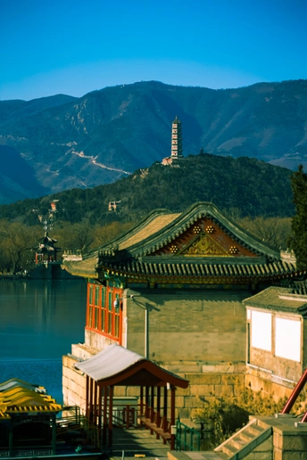 画面中展现了颐和园一幅古典雅致的景致。近处是古色古香的中式建筑,屋顶线条优美,装饰精美,红窗与灰墙相互映衬,尽显古朴韵味。建筑旁的水面平静如镜,泛着幽蓝的光泽。远处山峦连绵,郁郁葱葱,山顶矗立着一座宝塔,在蓝天的映衬下显得格外挺拔。整个画面融合了山水、建筑等元素,散发着浓厚的东方古典之美。