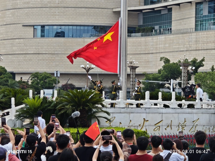 2025年8月1日清晨6点42分,八一广场上,国旗护卫队正庄严升旗。周围群众或举手机记录,或摇小国旗,背景建筑与绿植映衬,这是南昌纪念建军的重要时刻,承载着对历史的敬意与对祖国的热爱,是城市与民众共赴的热血之约 。