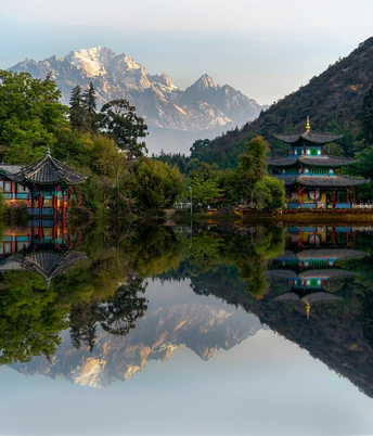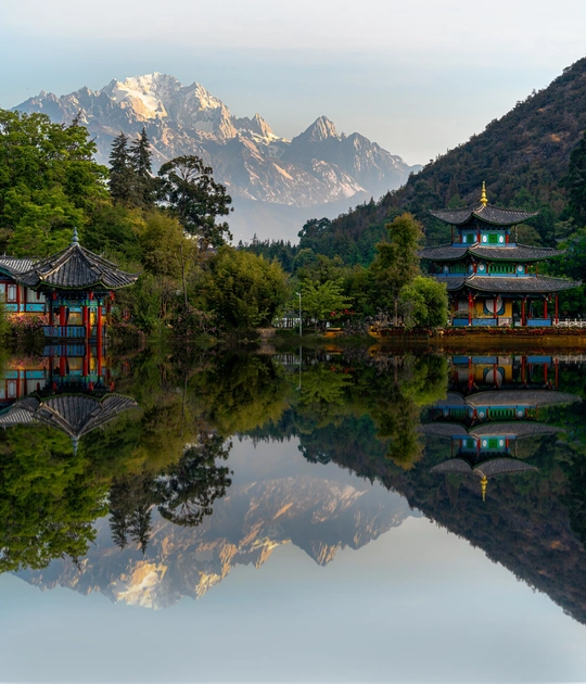 摄影创作逻辑: 构图:以 水平对称式构图 框取画面,潭水如镜面复刻天光山色,将玉龙雪山的巍峨与古建的精巧上下镜像叠合,制造 “天地双生” 的视觉震撼,强化空间平衡感。 光影:捕捉清晨 侧顺光 时刻 —— 雪山受光面被镀上暖金(日照金山初显),背光侧仍保留青灰冷峻;古建彩饰因柔光凸显饱和度,倒影因水面静稳清晰如绘,达成 “金棱 - 彩檐 - 镜波” 的明暗韵律。 意境:自然(雪山)与人文(古建)借潭水完成 “对话”,晨雾未散时的朦胧感,让远峰、近阁、镜影形成 “虚 - 实 - 虚” 的递进层次,诠释丽江 “雪山伴古邑” 的东方意境,定格 “静美晨晖里,天地共一镜” 的瞬间。