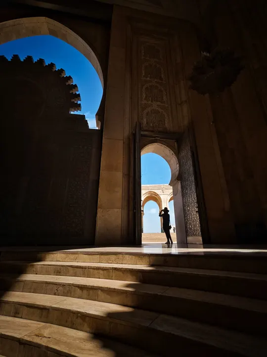 拍摄于摩洛哥,拱门层层嵌套,像打开时空的门,人物剪影点睛,光影洒在建筑里,神圣又神秘。土黄建筑与湛蓝天空形成对比,展现了人文与建筑的渺小与宏大