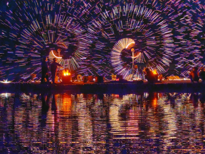襄阳大唐城的夜,被匠人手中的炽热铁水点燃。千度高温的铁水泼洒向夜空,刹那间化作漫天金花,似流星奔涌,如繁花绽放。坠落的璀璨与水面倒影交相辉映,一实一虚,一炽一柔,将这千年技艺的震撼与大唐城的古韵揉进同一帧画面,定格成那夜最动人的光痕。