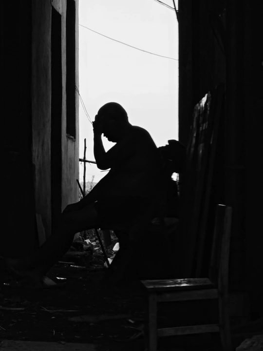 在光影交织的角落,他独坐一隅。身影被黑暗勾勒出轮廓,手轻轻搭在额头,似在沉思,又仿佛被生活的重负压弯了脊梁。周遭的杂乱,如同他内心的纷扰,此刻,在这寂静的空间里,他与自己的思绪对峙,那一抹孤独的剪影,诉说着不为人知的故事
