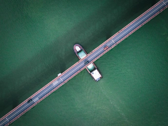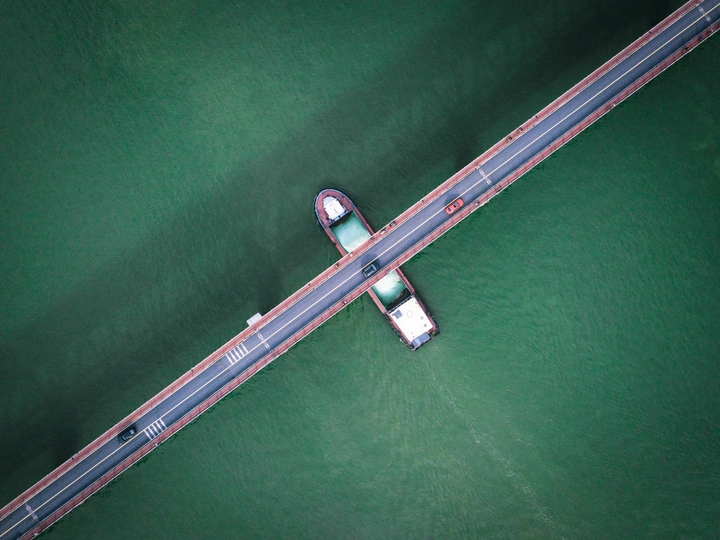 航拍视角下,桥梁如深色丝带横切翠绿水域,货船正巧穿桥而过,与桥构成十字交织。几辆汽车在桥面有序移动,动静相衬间,简单元素因巧妙时机与独特视角,碰撞出几何秩序与生活烟火交融的奇妙诗意,平凡场景里藏着偶然撞见的浪漫 。