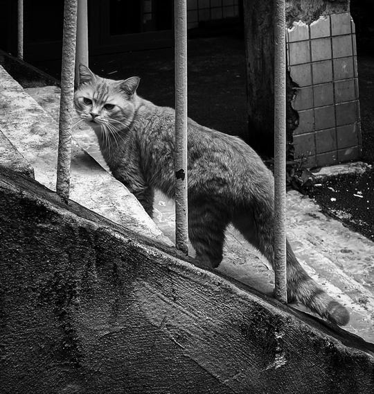 猫站在带有栏杆和老旧建筑的环境里,眼神看向镜头方向,可能是感觉到我的靠近,它正警惕地感知着周遭是否有异动或陌生气息靠近,身体姿态也保持着一种随时应对变化的状态。这一状态与周围斑驳的墙面、地面等环境形成画面,让这份警觉更具生活场景下的生动感和故事感。