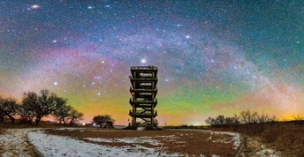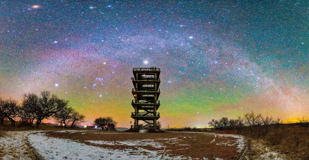 作者:Aillgoue 简介:广袤的天地间,白城揽海阁傲然伫立。夜幕降临,星河璀璨,银河如一条绚丽的丝带横跨天际,洒下梦幻的光辉。揽海阁仿佛一位沉默的守护者,见证着宇宙的浩瀚与神秘,在这静谧的氛围中,时间都仿佛静止,让人沉醉于这份独属于星空与高塔的浪漫与壮美 ★拍摄时间:2024年12月7日 ★星空打卡地:吉林省白城市 ★拍摄器材:索尼a7r3+ 唯卓士16F1.8,星陨柔焦镜 ★拍摄参数:快门13s,ISO4000,光圈f1.8,多张拼接。