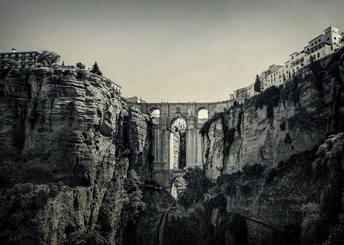 灰调镜头里,埃尔塔霍峡谷的峭壁如刀削般对峙,石材垒筑的桥身如巨人躬身,以三层拱洞串联起割裂的天地:上层拱洞衔接崖顶白墙屋舍,中层主拱洞吞吐峡谷长风,下层暗拱隐没于深渊阴影。这座始建于1751年、耗时42年完工的“新”桥,实则承载着两百年岁月——中段桥拱内曾是囚禁犯人的密室,如今化作博物馆,将天堑上的挣扎与征服娓娓道来。 98米的垂直落差里,崖壁的褶皱与建筑的棱角碰撞,海明威笔下“最适合私奔”的浪漫,与天险锻造的雄浑共生。新桥不仅是连接龙达新旧城区的通途,更是人类叩问自然的勋章,峡谷的沉默与桥的坚韧,在黑白光影中凝成永恒的惊叹。