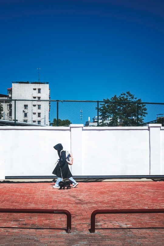 蓝天下,红砖铺就的小路显得异常醒目。一只可爱的小狗欢快地跳跃着,它的尾巴摇动得如同风中的芦苇,而它的主人则静静地走在旁边,他们的步伐和谐一致,仿佛在无声地交谈。