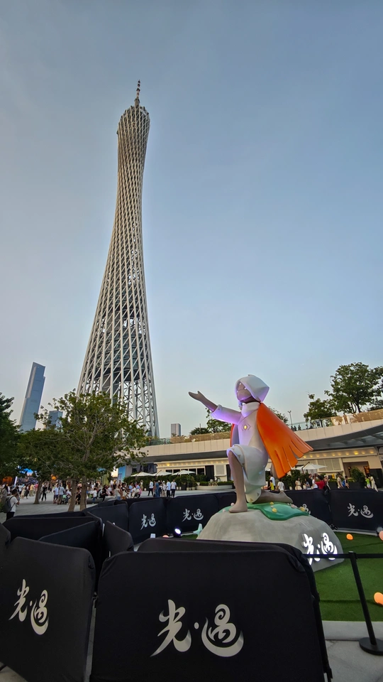 在广州塔下散步,被这只《光遇》小人儿可爱到! 斗篷在暮色里泛着暖光,伸着手像要拥抱广州塔,莫名浪漫~ 周围人来人往,大家都忍不住拍照,有种打破次元壁的奇妙感✨ 想起在游戏里跑图的日子,突然就共情了!这里超适合打卡,不管是游戏迷还是citywalk爱好者,都能get独特氛围感,随手一拍都是和广州塔的梦幻联动,快来邂逅这份小美好~