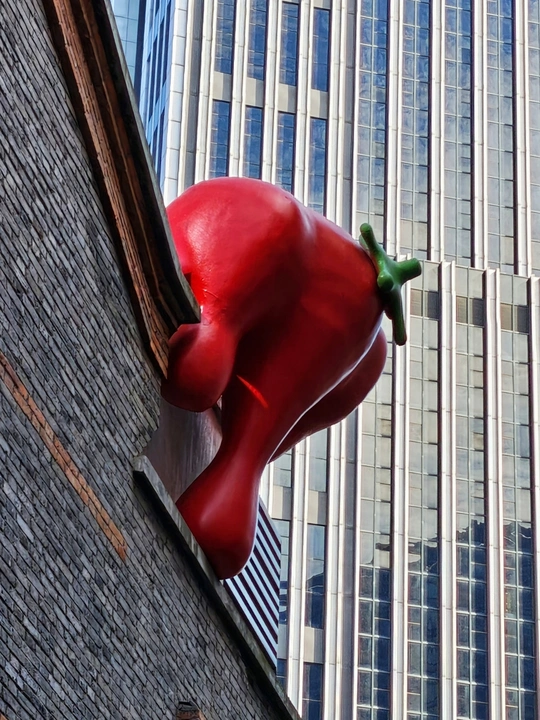 同一片天空下, 老墙的肌理与幕墙的折光激烈交锋, 那只若隐若现的熊屁股, 正是时空折叠的最佳注脚。