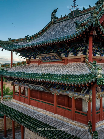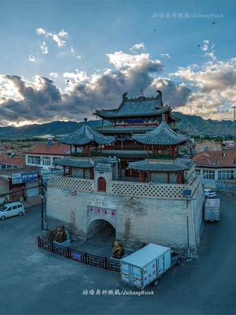 在河北阳原县东城北街,有一座巍峨的楼阁——玉皇阁。它始建于明嘉靖四十一年(1562年),原是顺圣川东城的过街门楼。旧时正殿三层、钟鼓楼两侧相伴,第一层供奉三官大帝,第二层是西王母大殿,最高层供奉玉皇大天尊。殿宇高约13米,琉璃飞檐反翘,钟鼓齐鸣,气势非凡。 咸丰七年正月十五,一场因道士烧香引发的大火,将殿阁付之一炬,连铜铸玉皇像的一条腿也被烧化。住持张元喜四处化缘,方得重修。碑记中开篇写道:“尤旧者易,创新者难……尤旧而鼎新以任旧则尤难”,可见复原旧制的艰难与执念。 同治八年重建后的玉皇阁,外观依旧三层,但内部改为“明三暗二”结构,西王母殿不再重建。雕梁画栋、壁画藻井、神像庄严,东边站神吕岳瘟神、温仲普化天尊,西边则是赵公明黑虎灵官与武吉将军,威风凛凛。大殿二层檐下的匾额写着“紫气东来”,三层南檐悬“得一以清”,西檐是“天开文运”,北檐柁头题“灵霄宝殿”。 2004年的大修,让玉皇阁再次焕发光彩——青砖台基稳固如山,朱红廊柱与飞檐琉璃瓦交相辉映。如今虽已不闻晨钟暮鼓,但晚霞映阁、风铃叮咚间,依然能感受到它跨越四百余年的从容与庄严。