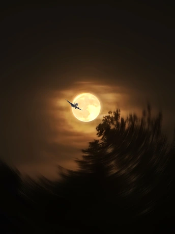 当月光给云朵镀上银边,飞机正以优雅的弧线穿过树梢,树影斑驳如大地的碎银,坠入深蓝的梦境。