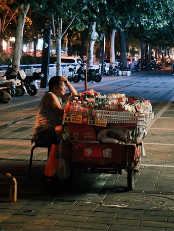 路灯昏暗,十二点的国际庄中山路街道终于卸下喧嚣。老大爷蜷缩坐在旧凳子上,闭着眼,左手扶着头,倚着身前那台吱呀作响的三轮车。夏夜的热浪不肯退去,蒸腾着柏油路面,也闷住了他的呼吸。推车上的保温杯里,枸杞早已沉底,杯沿也磨花了颜色。 几只飞蛾不知疲倦,一头头撞向灼烫的灯泡,发出微弱的扑簌声,如同命运无言的撞击。一个代驾司机匆匆跑来,汗珠在路灯下反光:“来瓶凉的!”大爷眼皮掀开一线,迅速起身,递水收钱,动作早已刻进骨子里。动作间,保温杯被碰倒,几颗枸杞滚落尘土,他默默俯身拾起,吹了吹又放回去。 几个醉醺醺的年轻人晃过,笑声尖利。大爷只垂着眼,看着自己脚上那双磨得泛白的旧鞋,鞋跟已歪斜了方向。他复又闭上眼,任汗珠顺着脖颈蜿蜒而下,消失在领口深处。车上最后几瓶水凝出的水珠沿着箱壁滑落,滴在地上,转眼就被滚烫的柏油路面吸干,只留下一点深色的印记,像生活咬下的齿痕。那水珠,分明是冰水化成的汗,抑或是汗结成的冰? 夜更深了,街道终于逐渐空荡。大爷倚回三轮车,眼皮沉重地合上。路灯拉长他蜷缩的身影,像一粒被遗忘的微尘,暂时安歇在灼热大地之上。
