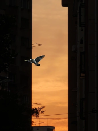 当最后一抹晚霞融化在建筑的棱角间,鸟儿振翅掠过天际,羽翼镀上熔金,像挣脱地心引力的白色火焰,将城市切割成流动的剪影。