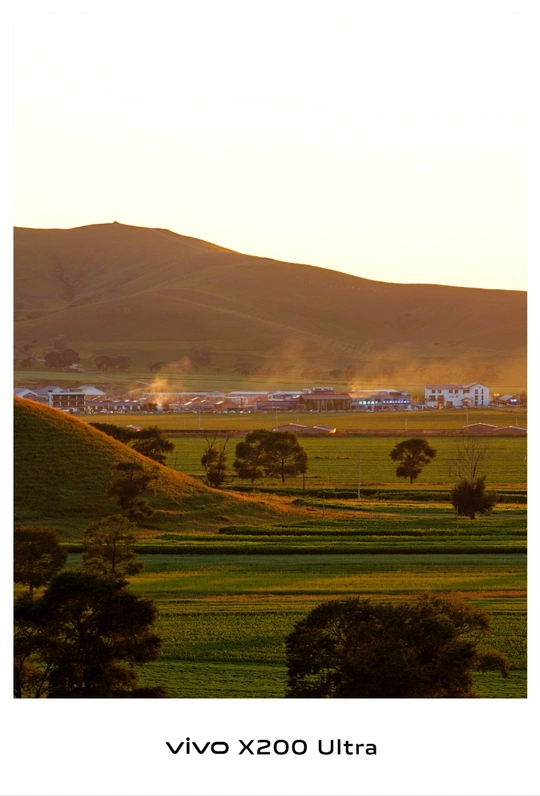 当暮色轻笼坝上草原,夕阳的光辉为大地镀上一层暖金。起伏的山丘、广袤的田野,还有散落的村落,在这柔和光线里,彼此依偎。村落中透出的微光与缭绕的炊烟,似在与自然轻声诉说,绘就一幅温柔且充满生活气息的田园画卷。