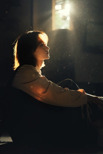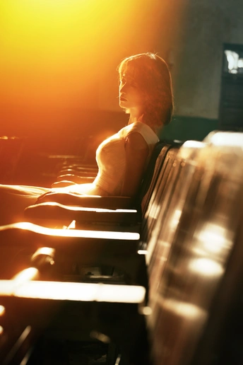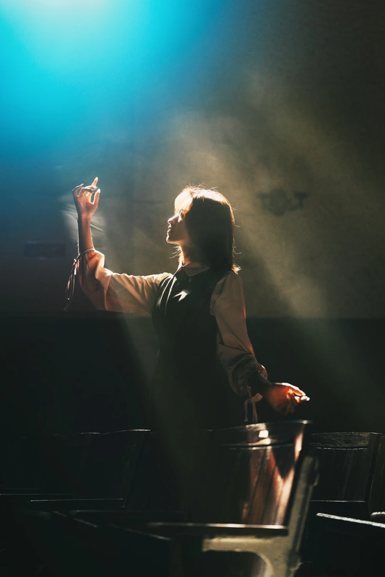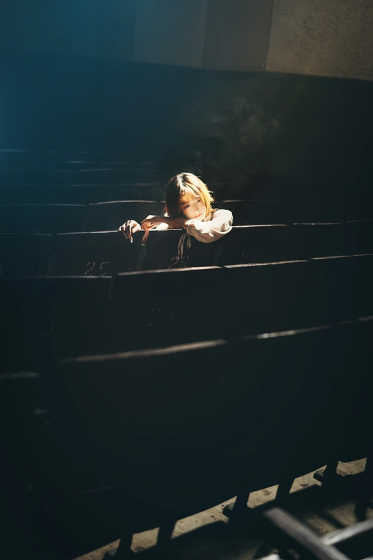荧幕蓝瀑炸裂侧脸, 颧骨浮出冷焰刺青; 过道红灯淌过锁骨, 在喉结淤积成暖锈。 座椅峡谷底—— 左瞳放映未映的胶片, 右眼暗房正显影。