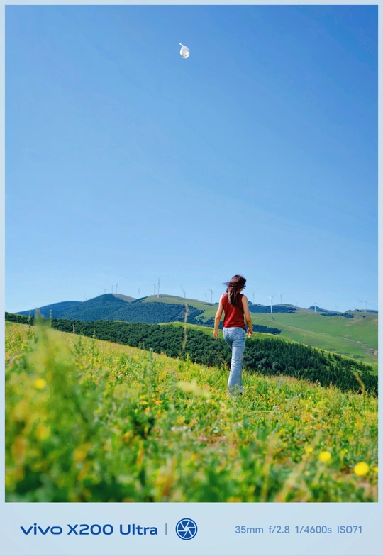 云上草原上,帽子在空中飞舞,人物在草地上漫步,vivo X200 Ultra 精准记录下这灵动场景,传递出自然里的自由气息。