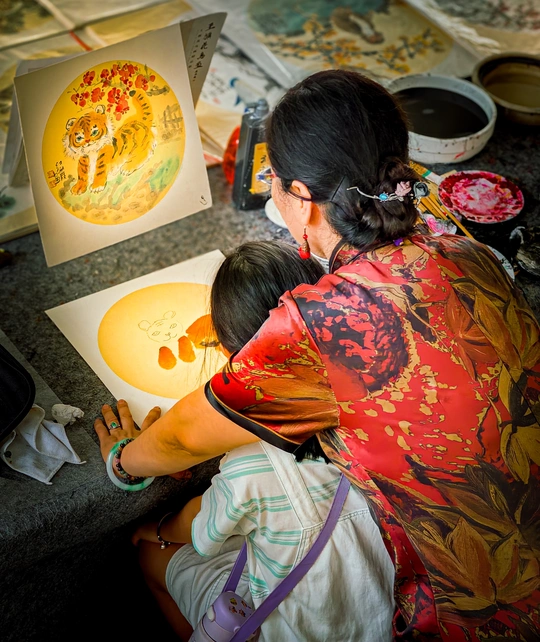 一方画案,两代人。长辈以言传身教,传递国画的笔墨温度,孩童用专注,承接传统文化的脉络。一笔一墨间,是技艺传承,更是祖孙间无声的深情,让古老艺术在岁月里,静静流淌新的故事 。