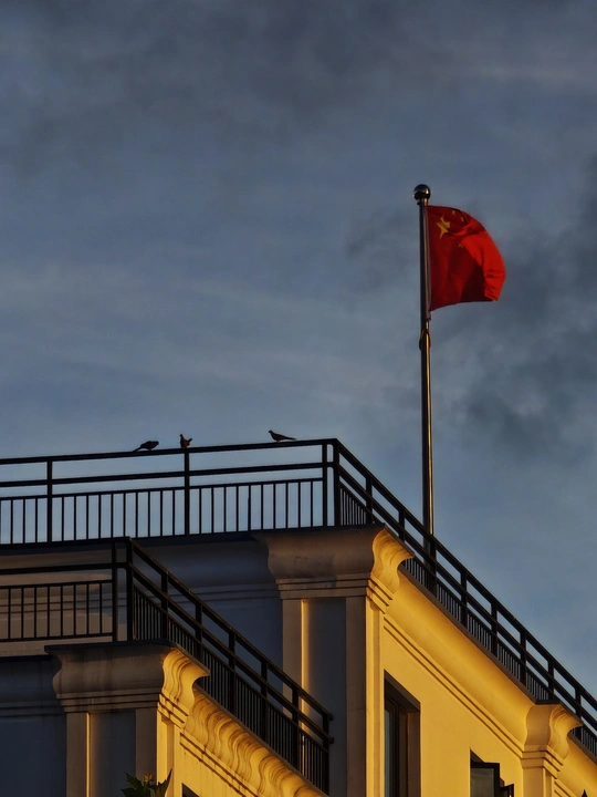 夕阳下的建筑外墙金色披肩,和平鸽静静地瞭望着红旗迎风飘扬……