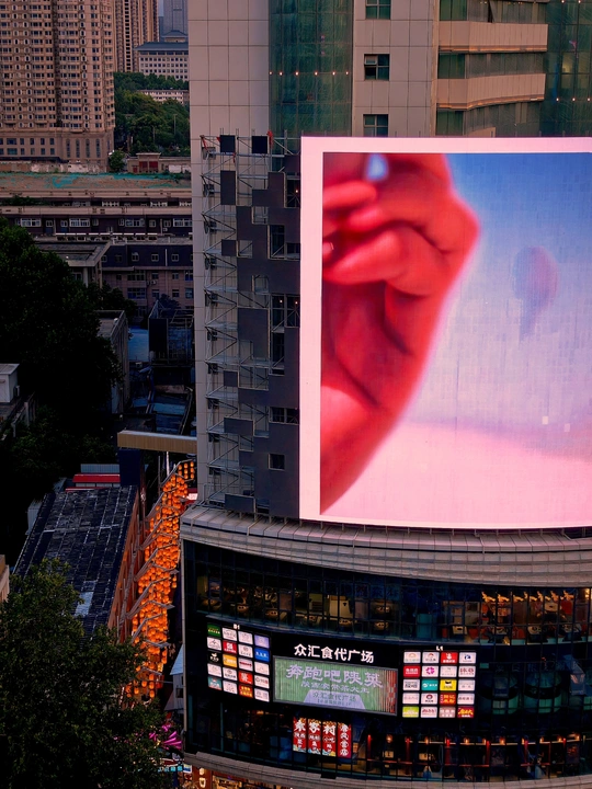 灯笼步行街、商超二楼红色餐厅的城市日常与超现实巨手画面的融合、碰撞。
