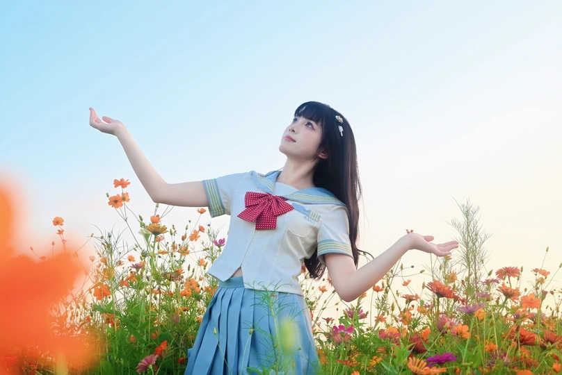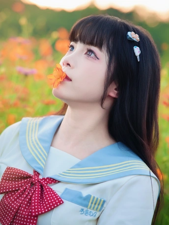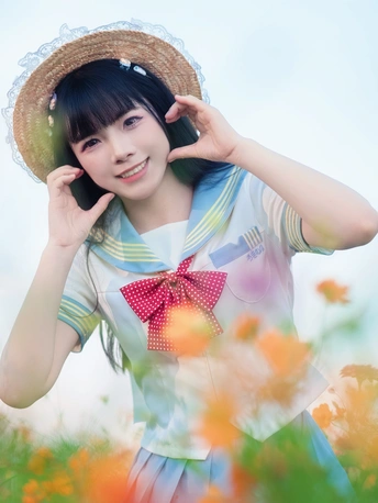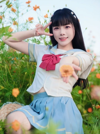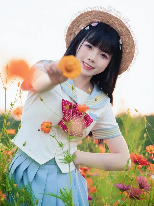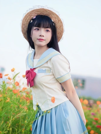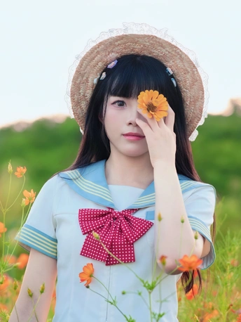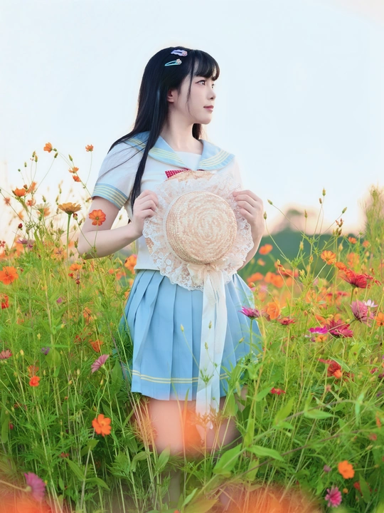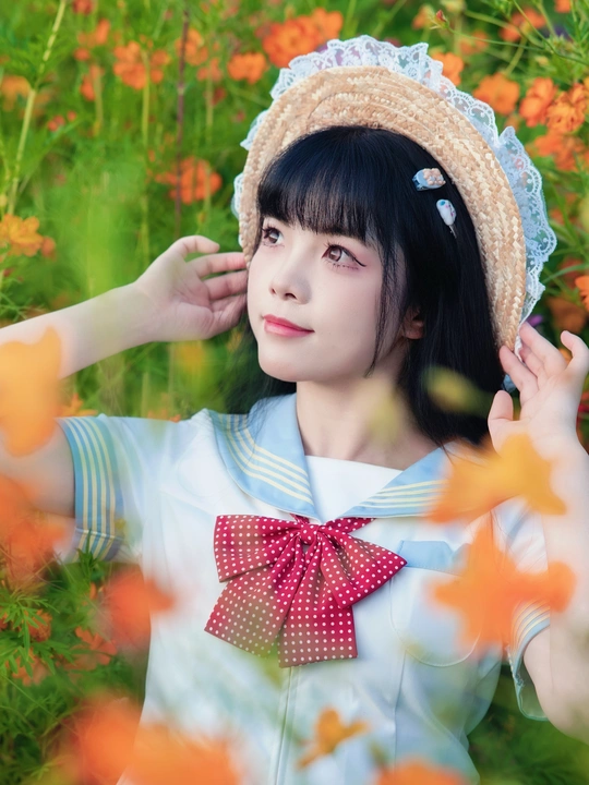 草帽轻笼青丝长 水手服裁夏日光 格桑花绽橙黄里 一笑惊飞满草香🍃