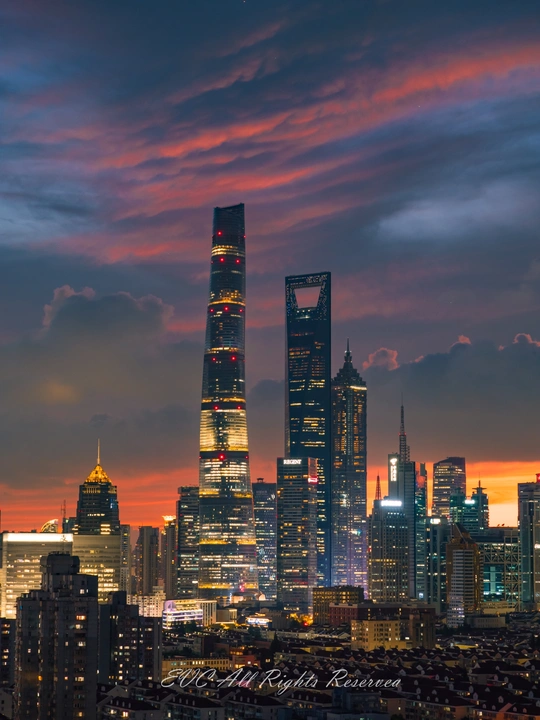 2024年台风“贝碧嘉”来临前夕,陆家嘴上空阴云密布,迫近日落时,出现了难得一见的晚霞,充满压迫感的低云被染上暗红的暮光。天空中的晚霞与陆家嘴的内透灯光仿佛把遥不可及的天地连接到了一起,阴沉的云层给整个上海覆盖上了压抑的氛围,陆家嘴一瞬间化身为末日孤城。