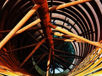 树状螺旋坡道如钢铁巨龙盘踞云端,光影在镜面钢构上跳跃,飞鸟掠过时翼影与钢纹交织,划破天际的不仅是弧线,更是突破重力的视觉诗篇。