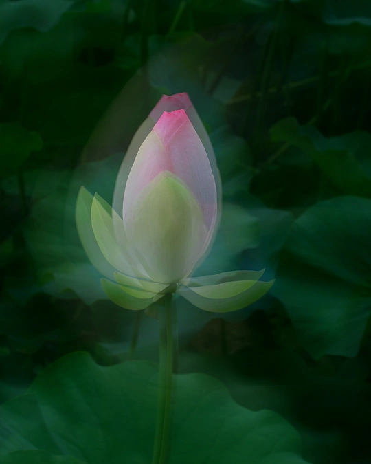 摄于:2025年6月一7月,莲花的花瓣或粉嫩娇艳,或洁白无瑕,它们在水中亭亭玉立,花瓣的形状各异,有的宽大饱满,有的细长如丝。当它们处于“疏影”的状态时,意味着荷花并非密集地生长在一起,而是相互之间有一定的间隔,这种疏密有致的布局使得每一朵莲花都能展现出自己独特的姿态。它们或高或低,或正或斜,有的像是在翩翩起舞,有的则像是在静静沉思,仿佛是大自然精心安排的舞者,以一种优雅而从容的姿态展示着生命的美丽。富士中画幅相机GFX100s,镜头100-400mm加1.4增距镜,(创意摄影多重曝光而得)。