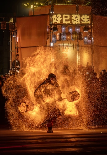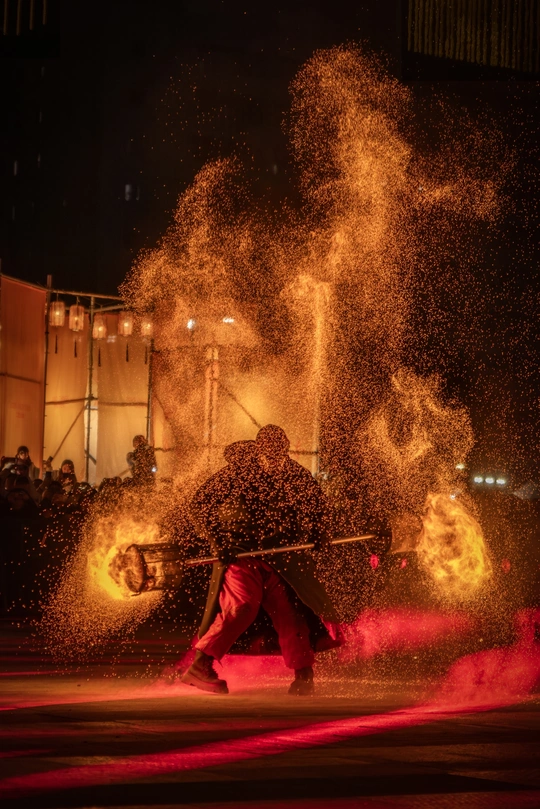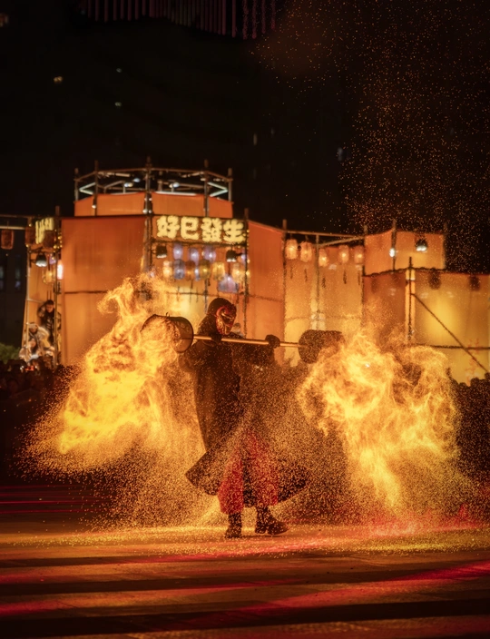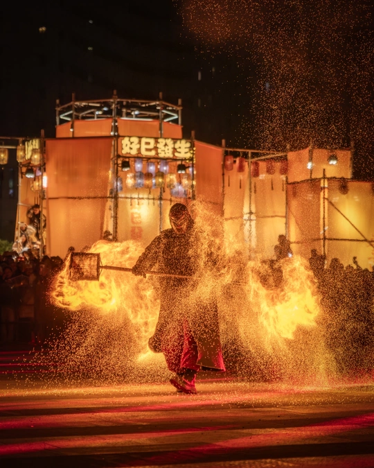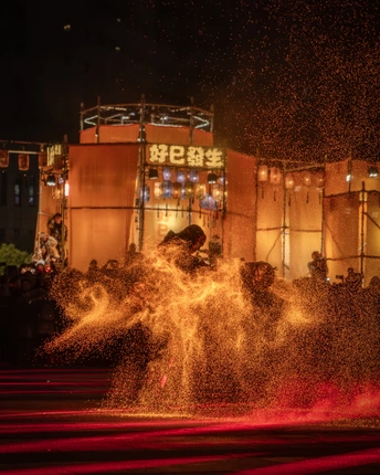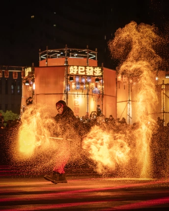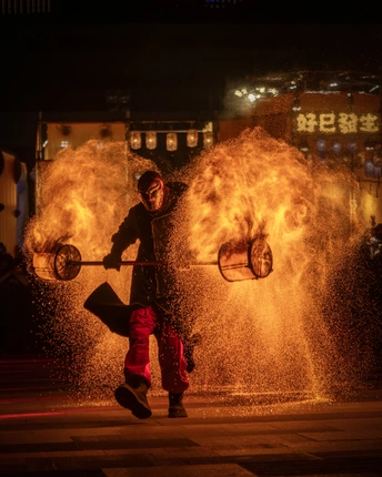 2025年元宵节,暮色刚合,一场火壶舞便在喧嚷中点燃了夜。舞者身披曳地长褂,面覆神兽面具,双手横执特制火壶——两端铁笼里的炽热铁水,随旋身、甩臂的劲道泼洒开来,瞬间化作金红焰火瀑,万千火星如流萤迸溅,在夜幕下织就流动的光网。 背景中“好巳發生”的灯牌明灭,呼应着癸巳蛇年的新岁期许。围观人群的目光被火浪裹挟,随舞者的步伐起伏:铁火飞溅时,热浪扑脸,却又因舞者精准的动作幻化成安全的炽热狂欢。这源自民间的火舞,本是元宵“驱邪避凶”的古俗,如今更以震撼视觉,将“烟火庆新岁”的意趣推向极致——火星跃动里,是对蛇年顺遂的热忱祈愿,更是民俗传承在当代迸发出的炽热脉动。