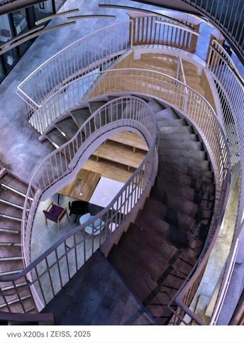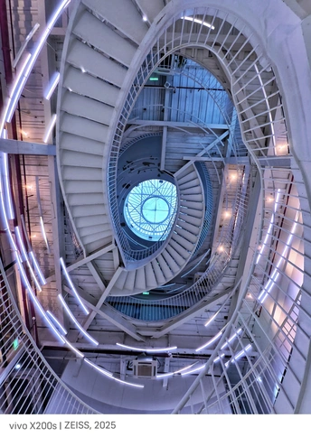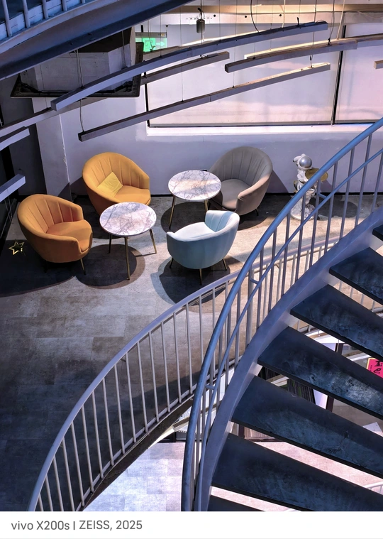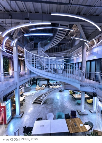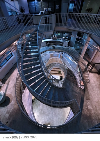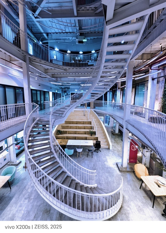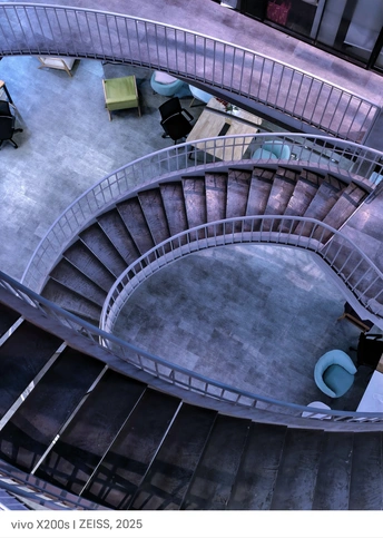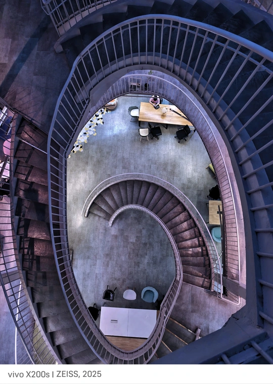 在上海一处开放式的共享办公空间里,一道螺旋式楼梯展现出十足的现代气息。使用超广角拍摄,视觉张力效果十足!vivo X200S拍摄。
