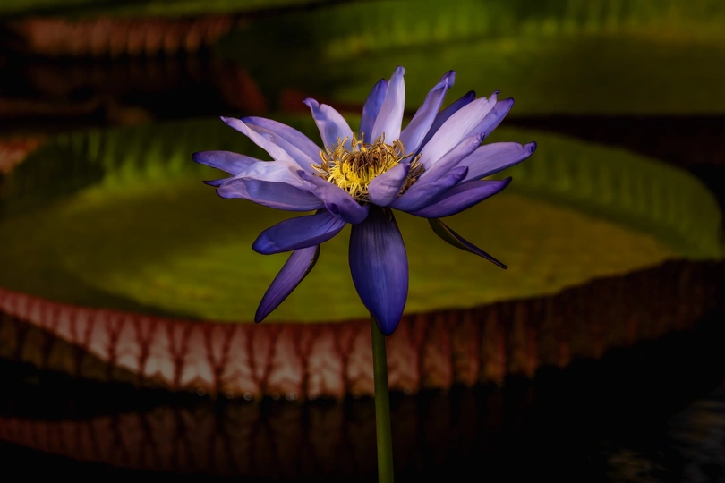 在霸王莲叶的边上,紫色的睡莲独自绽放。 霸王莲叶宽大而霸气,犹如绿色的巨伞,彰显着强大的生命力。而一旁的紫色睡莲,却以它的柔美与宁静形成鲜明对比。 紫色的花瓣娇嫩欲滴,在微风中轻轻摆动,仿佛在诉说着自己的故事。它不与霸王莲争辉,却在其边上绽放出独特的光彩。 它像是一位遗世独立的仙子,静静地享受着属于自己的时光。