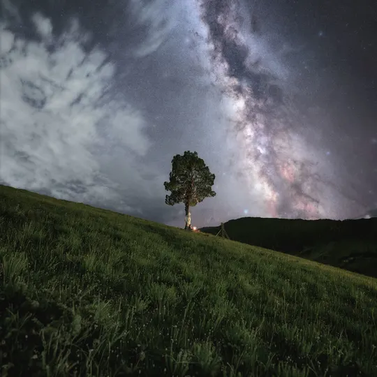和曾经的自己仰望同一片星空! 这是这次星空之旅的第二颗树,相比第一颗树所在的位置,会更加难到达!但是能出片一切都值得! 拍摄时间:8.18 拍摄地点:甘孜玉科 拍摄流程:天空部分用赤道仪拍摄了80sx2,地面部分拍摄了30s! 拍摄器材:z6ii改机+1424f2.8 (9.6-9.9号月全食银河之旅,招募ing)