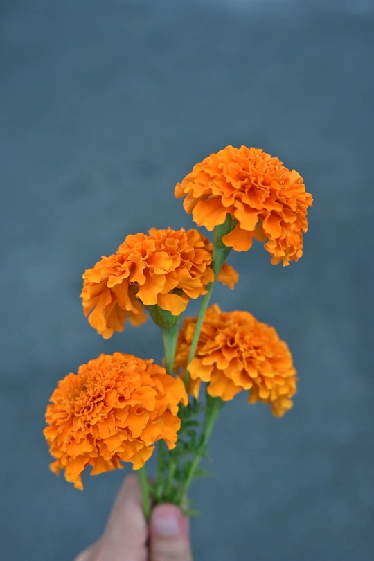 橙炽蓝谧,用镜头捕捉到橙与蓝的化学反应——四朵万寿菊在湛蓝背景前如同跳动的火焰。 高饱和的撞色带来视觉冲击,花瓣的丝绒质感与背景的纯净形成奇妙平衡。 万寿菊在古印第安文化中象征太阳的能量,这组影像正是光与生命力的具象表达。