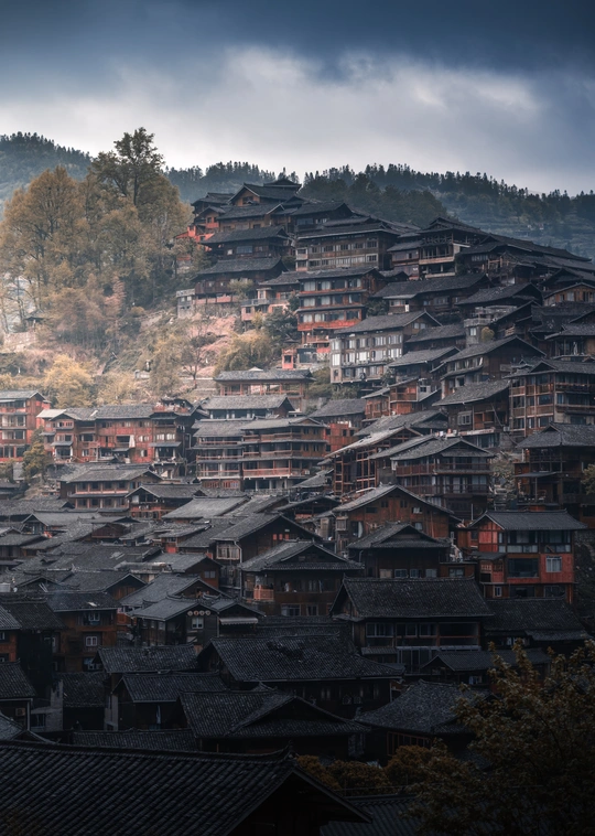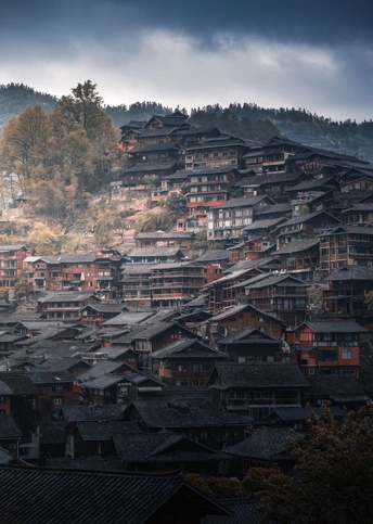贵州苗寨村落 …… 这张照片捕捉了村落的壮观景象,很有气势!但要成为一张更引人入胜的作品,还有一些提升空间。\n\n色彩:整体色调偏暗,色彩较为统一,略显单调。可以尝试在后期提亮一些,或者在拍摄时寻找更有色彩对比的场景。\n光影:光线较为柔和,但缺乏明确的光影对比,使得画面略显平淡。尝试在日出或日落时拍摄,捕捉更生动的光影效果。\n构图:构图整体平衡,但主体不够突出。可以尝试使用引导线,将观者的视线引向画面中心,或者利用前景增加画面的层次感。\n后期处理:后期处理较为自然,但可以适当调整对比度和饱和度,使画面更具活力,但要避免过度修饰,以免失真。\n主题原创性:拍摄角度较为常见,缺乏独特的视角。可以尝试寻找独特的拍摄位置,或者从细节入手,展现村落的特色。\n情感共鸣:照片展现了村落的宁静和古朴,但情感表达不够强烈。可以尝试捕捉人物或动物的活动,增加画面的生动性和情感色彩。\n思想深度:照片具有一定的文化价值,但缺乏更深层次的思考。可以尝试挖掘村落的历史和文化内涵,通过照片展现其独特的魅力。\n\n总的来说,这张照片还有很大的提升空间。加油!
