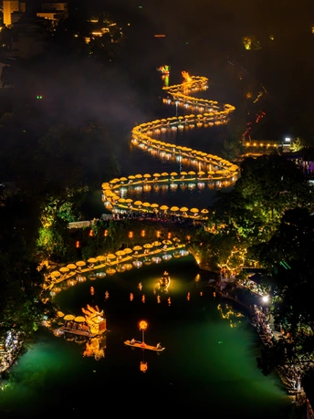在阳朔遇龙河的夜晚,金龙巡游与灯船群像交织,共同勾勒出一幅灵动的水墨长卷。金色龙身如泼墨般蜿蜒在河面,与点点灯伞(如繁星坠入碧波)晕染出层层鎏金光影;岸边树影、建筑在夜色里若隐若现,恰似水墨画中朦胧的远山与村落。随着金龙与灯船缓缓移动,这幅长卷也在河道间不断延展,龙鳞的光泽、灯伞的暖黄、水波的清辉相互晕染,把遇龙河的夜晚写成一首带着东方诗意的浪漫长诗。