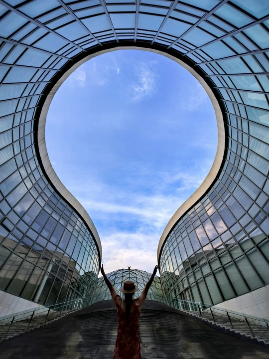 夕阳下的穹顶之下,红裙女子张开双臂拥抱上面一层的男士,形成一个呼应