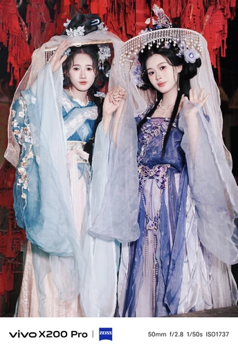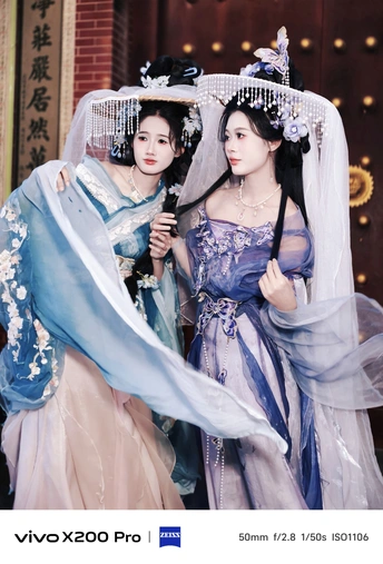 初秋时节的傍晚,两名妙龄少女头戴帷帽、身披素雅的轻纱,缓步穿行于赤坎老街,静静感受着小巷周边古色古香的独特气氛。她们的微笑如桃花般娇艳欲滴,身姿如天使般优雅轻盈,令人过目难忘。。 Shot on vivo X200 Pro.
