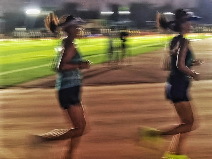 夜晚的运动场上,两个相约跑步的女生迈着整齐的步伐,在灯火阑珊里同频奔跑。