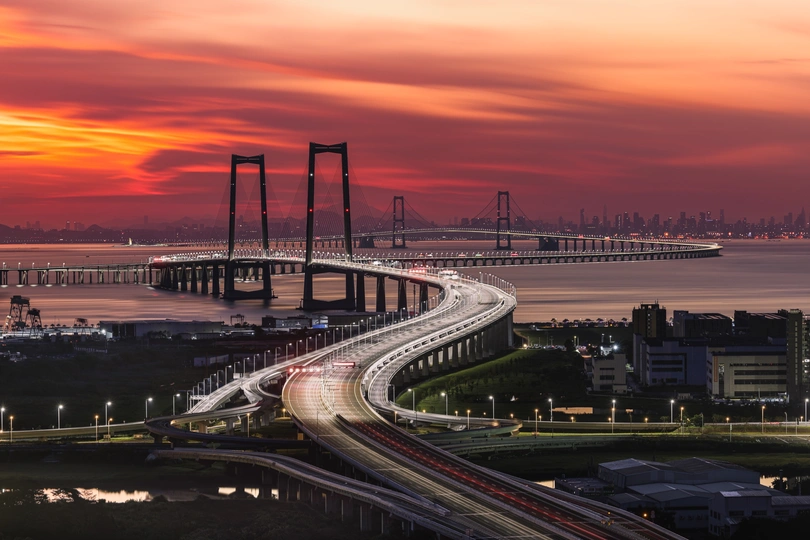 在伶仃洋的晨曦里,深中通道如璀璨巨龙,横跨海面。桥上车流如织,灯光串起灵动光带,与天边绚烂朝霞、远处城市的灯火交相辉映。它不仅是联通湾区的交通动脉,更是续写着新时代发展的壮美篇章,见证着这片热土的蓬勃与腾飞。