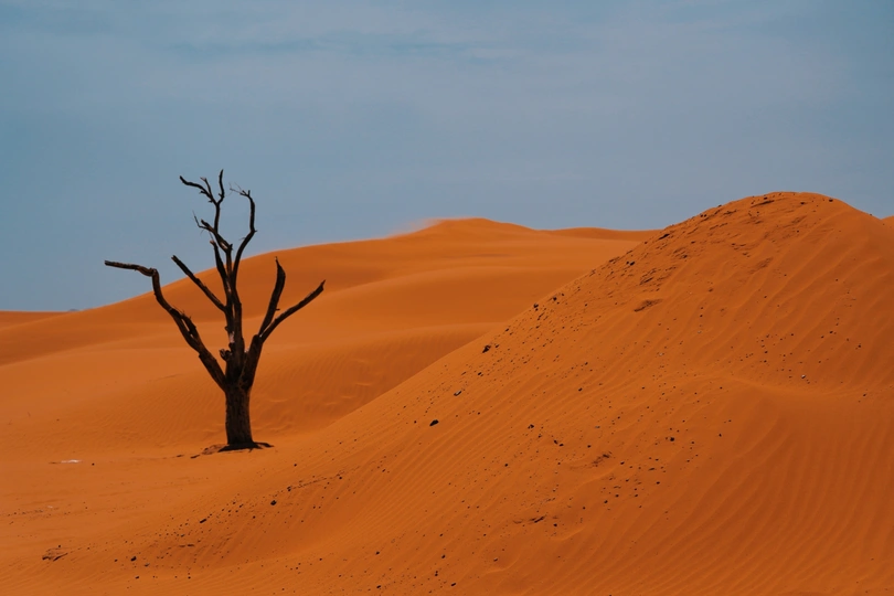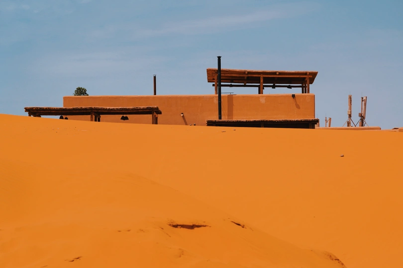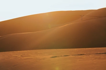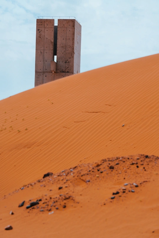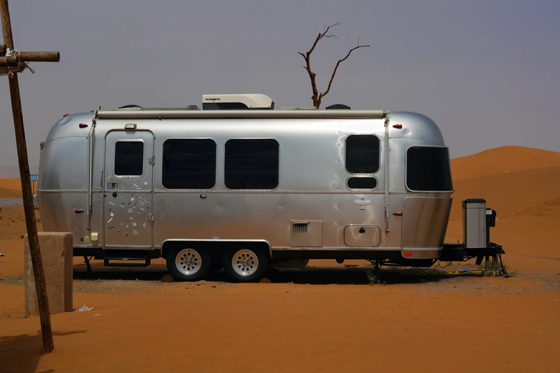 这张照片捕捉了一个独特的场景,银色的旅行拖车与广袤的沙漠形成鲜明对比,营造出一种超现实的氛围。构图上,拖车占据了画面的主要位置,简洁而有力,引导观者的视线。光线虽然较为柔和,但很好地展现了拖车的金属质感和沙漠的纹理。色彩方面,银色与黄色的对比,以及远处树枝的加入,为画面增添了一丝生机。整体而言,作品在主题表达和氛围营造上都比较成功,展现了摄影师对场景的独特视角和审美。