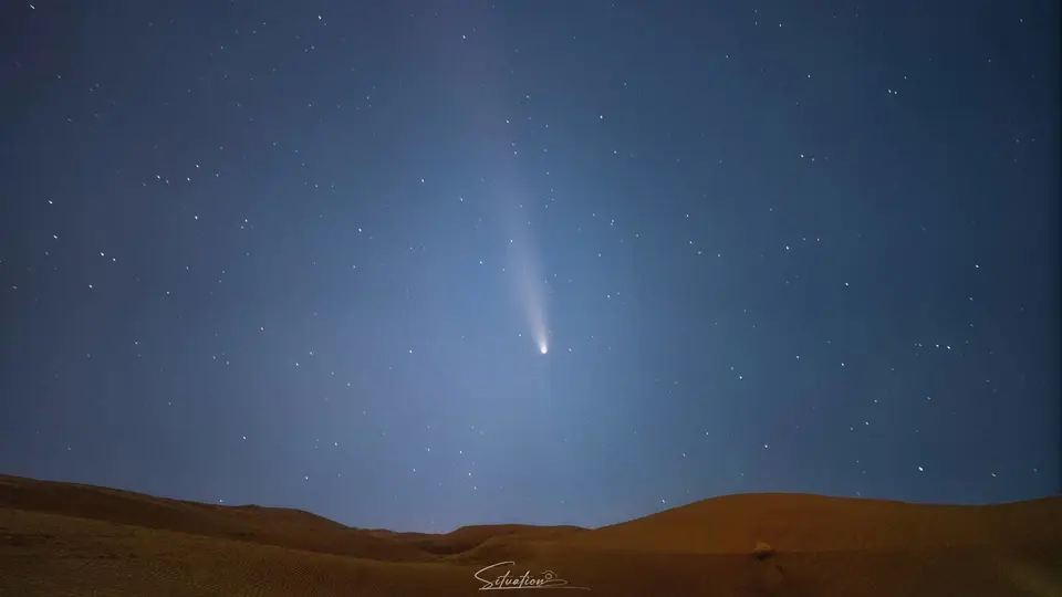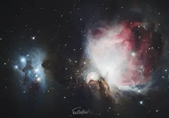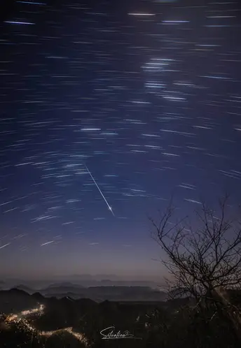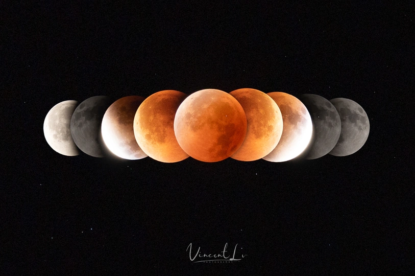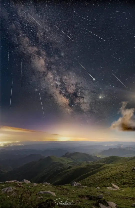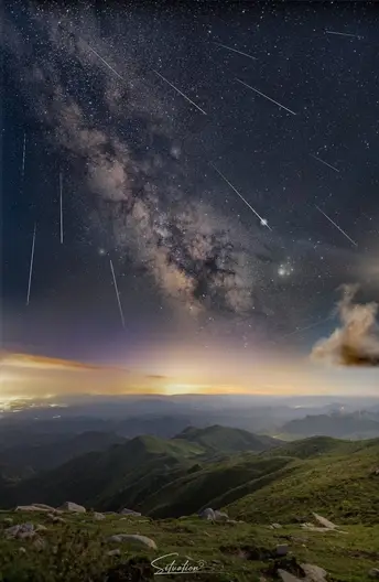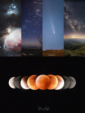 - 左侧第一张是猎户座星云,它是银河系中最壮丽的星云之一,充满了新生的恒星,色彩斑斓的气体和尘埃交织,如宇宙中的“恒星 nursery”,孕育着无数星辰。 - 左二是星轨与流星的同框画面,星轨是恒星在长时间曝光下留下的轨迹,搭配划破天际的流星,仿佛在静谧的夜空中书写着宇宙的动态韵律。 - 左三是彗星的影像,彗星拖着长长的彗尾在星空遨游,那是由其释放的气体和尘埃受太阳风影响形成的,宛如宇宙中的“流浪者”,带着神秘的气息穿梭于星际。 - 左四是银河与流星雨的景观,璀璨的银河横跨天际,流星雨如天女散花般点缀其间,下方的山峦则为这浩瀚的宇宙景观增添了大地的厚重感。 - 下方是月全食的过程,从初亏到食既、食甚,再到生光、复圆,月亮在地球阴影的作用下呈现出从明亮到红铜色再到恢复皎洁的奇妙变化,红色的月面(血月)是阳光经地球大气层散射后,红光折射到月球表面形成的,极具视觉冲击力。